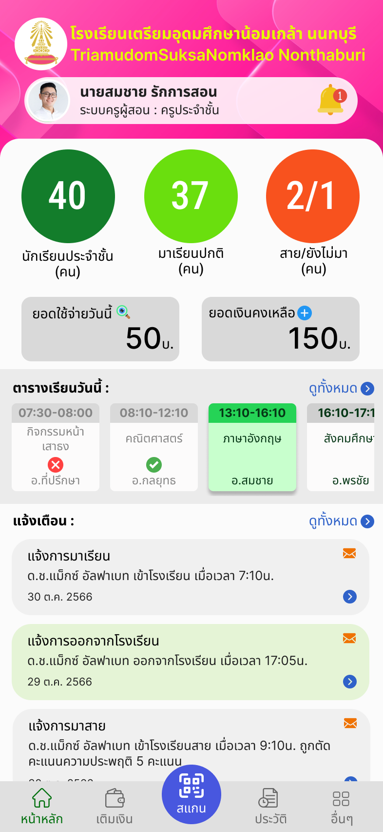 ครูผู้สอนสามารถบันทึกเช็คชื่อการมาเรียน และแจ้งผลไปยังนักเรียนและผู้ปกครอง หากมีการขาดเรียนในแต่ละวิชา