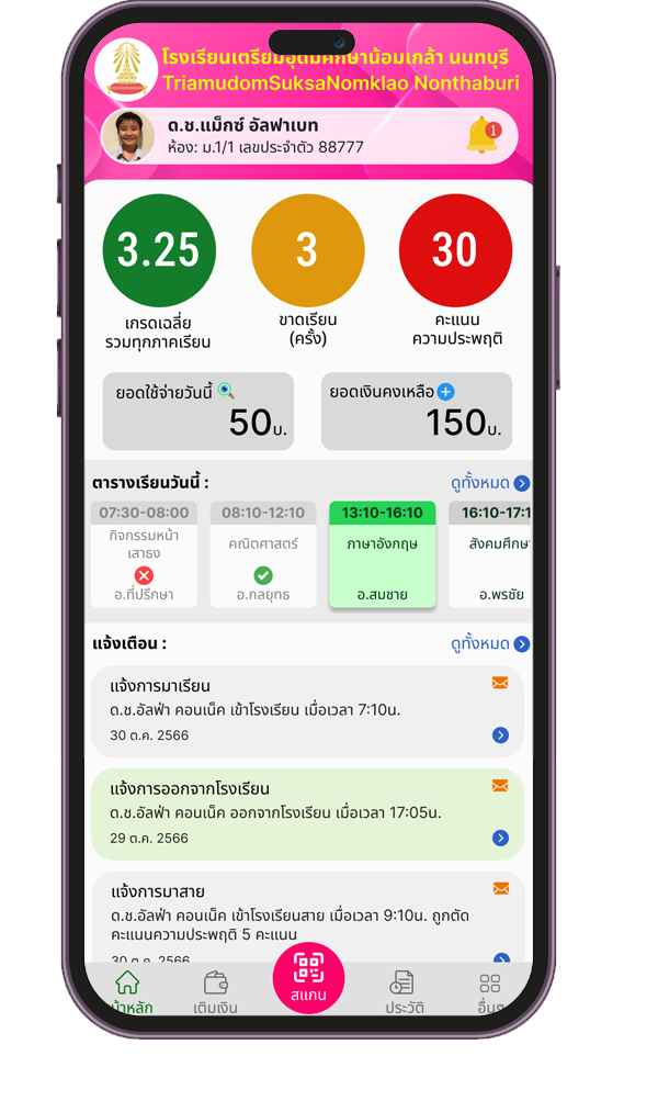 เพิ่มความสะดวกให้กับทั้งนักเรียน และผู้ปกครอง พร้อมระบบแจ้งเตือน ช่วยให้ไม่พลาดการสื่อสารสำคัญจากทางโรงเรียน